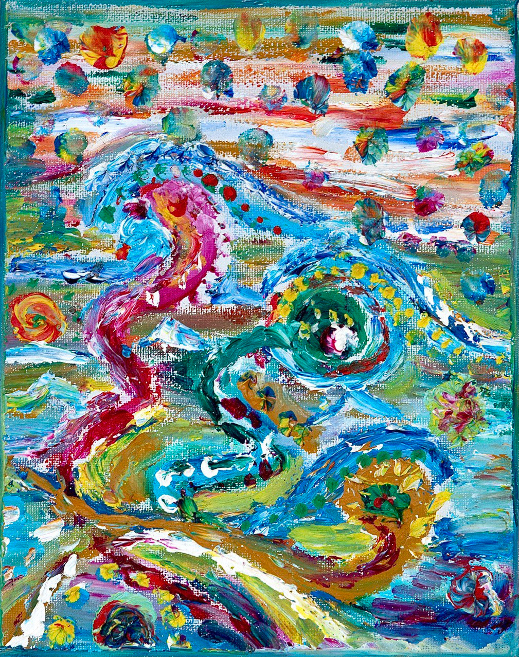 Abundance leads to choices of abandonment. For example, in creating this painting, I embraced numerous colors while setting aside others. Deepak Chopra defines true abundance as an experience where all our needs are effortlessly satisfied, and our desires naturally fulfilled. He suggests true abundance is felt as joy, health, happiness, and a profound sense of purpose and vitality in every moment of our existence.